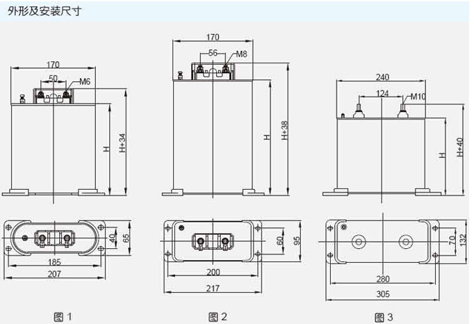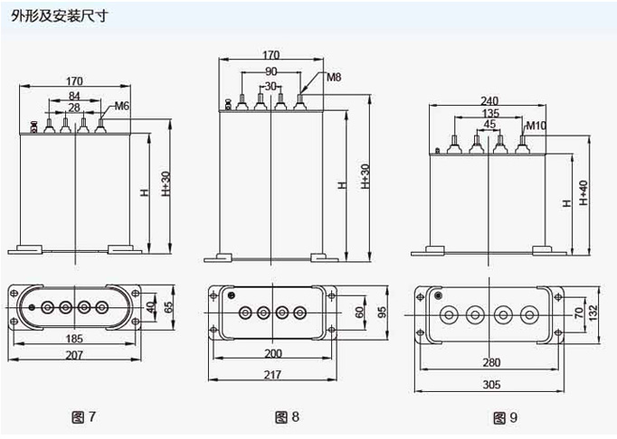 产品型号 BSMJ | 额定电压 (kV) | 额定容量(kvar) | 额定电容 (μF) | 额定电流 (三相/单相)(A) | 额定频率(Hz) | 高度 (H)mm | 图号 |